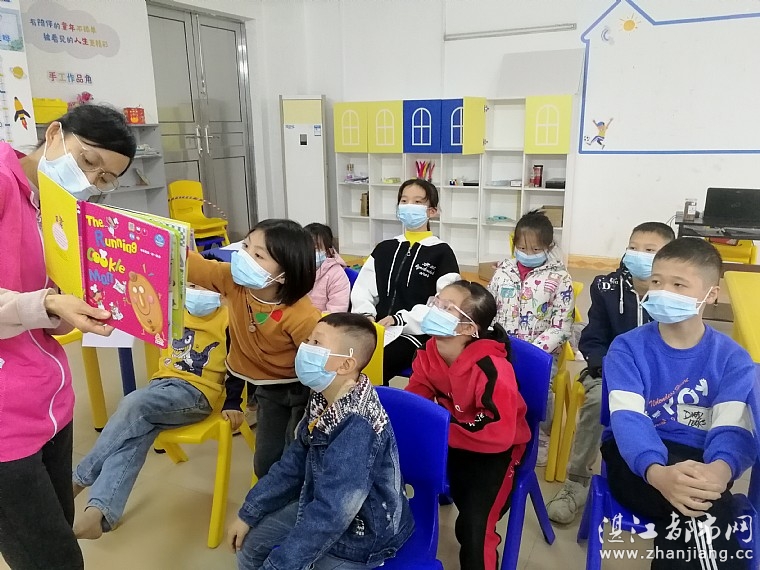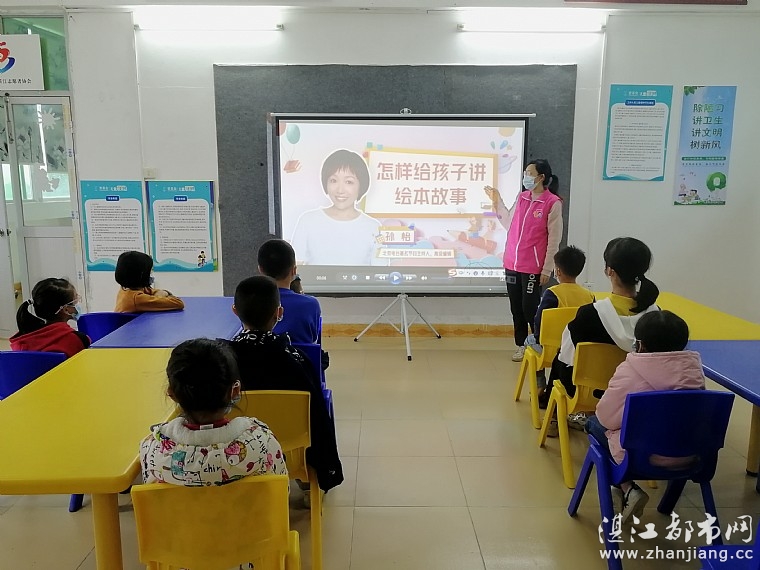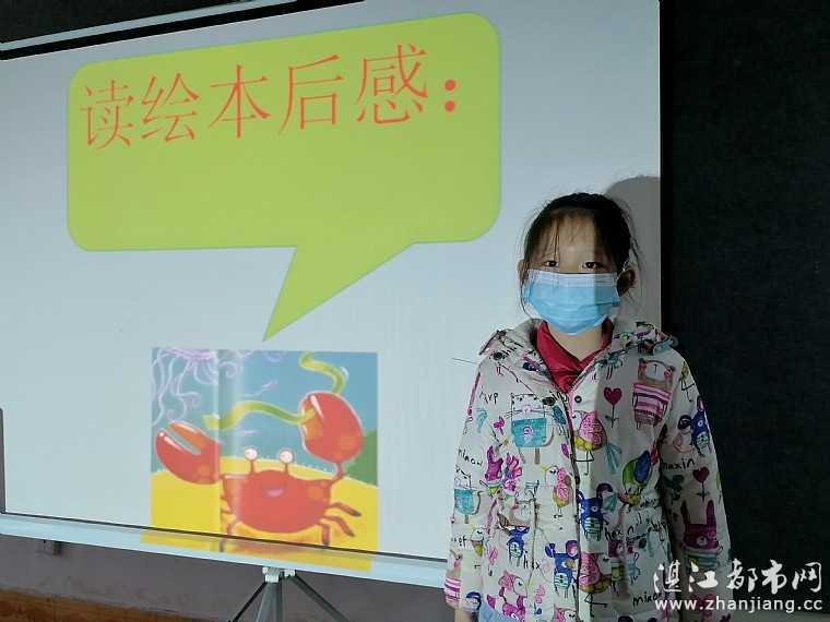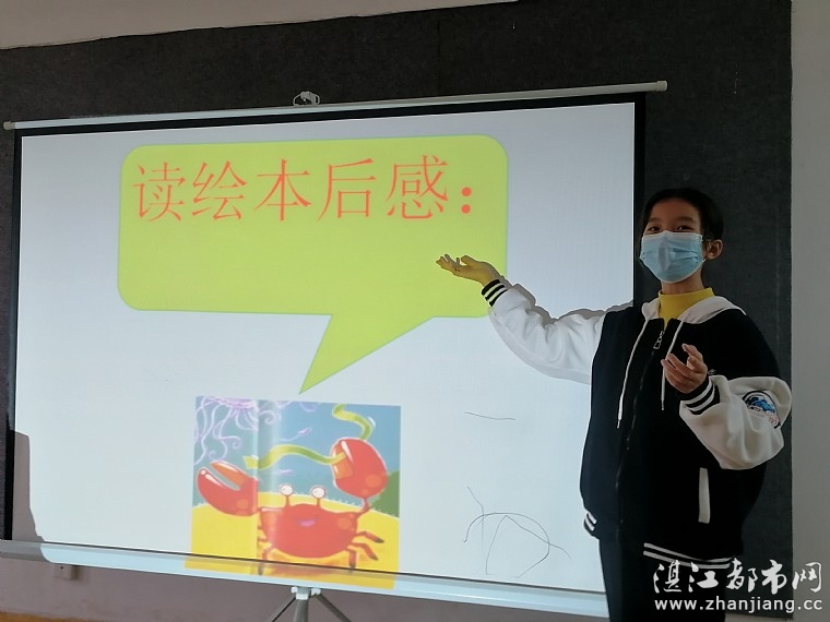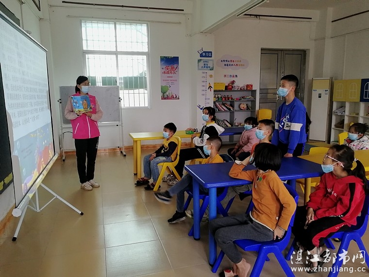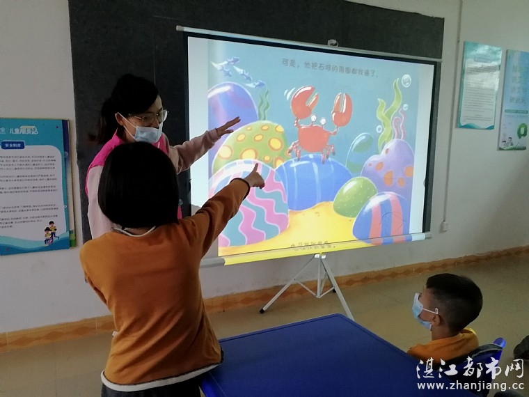 当天下午,情暖湛江志愿者、坡头镇文化站专职人员通过PPT授课和现场互动方式紧紧围绕以下四个环节展开:一、专职人员带领孩子们观看由小雨姐姐(北京电台著名节目主持人)录制的《怎样给孩子讲绘本故事》、《和孩子读完绘本后还能做什么》两个视频;二、专职人员通过PPT和绘本实物带领孩子们一起阅读绘本《笨拙的螃蟹》、《The running cookie man》;三、孩子们阅读绘本后的感言;四、现场创设情景剧(改编故事)。