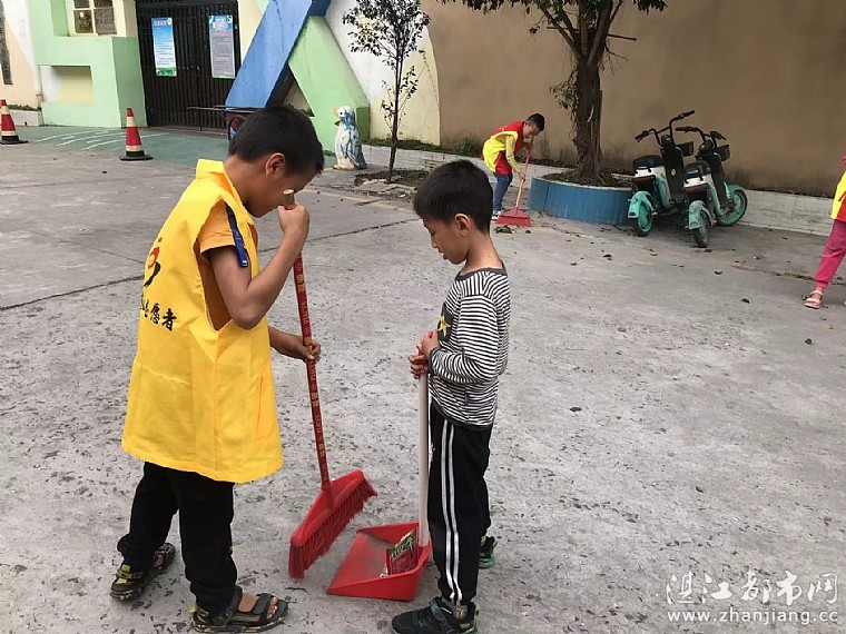 小志愿者们在儿童服务站专职老师们的带领下,有秩序地来到青少年宫文化广场上,两人一组,五人一群,有人手持扫帚,有人手拿簸箕,有人拿垃圾桶,扫啊,捡啊,不亦乐乎, 脸上的笑容与旁人的称赞相映成辉。