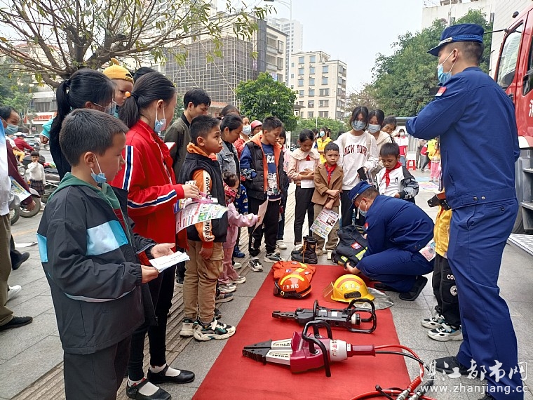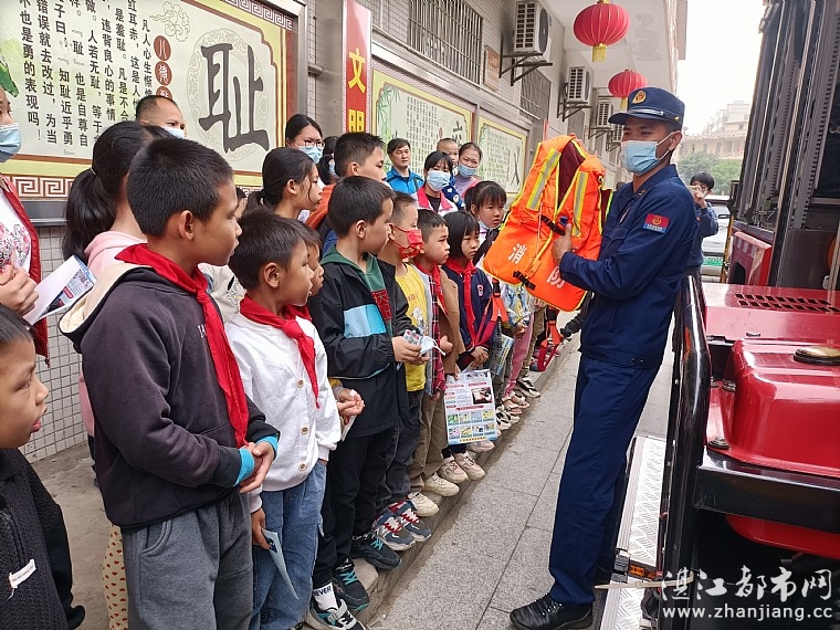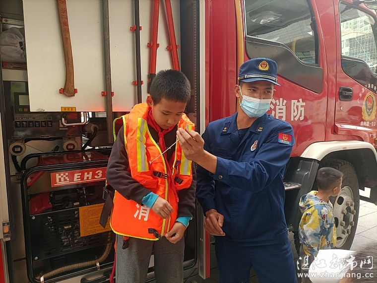 救生衣是消防车上必不可少的装备,比起我们常见的救生衣,消防战士的救生衣有更多功能,图为消防战士在教孩子们认识专业的救生衣及用法。