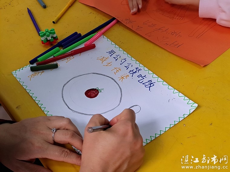 活动结合了设计倡导公勺公筷标语的环节,老师给孩子们分发了彩笔和空白纸以及彩色卡纸,让家长帮助孩子们一起去想一些合适的关于公勺公筷的宣传标语,通过写和画的方式去展现出来。
