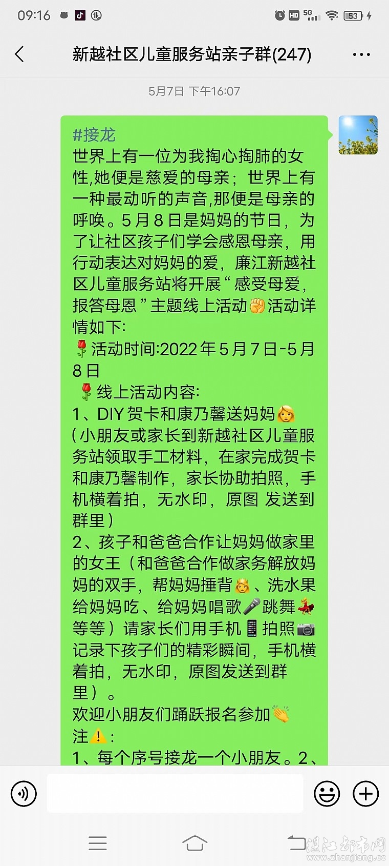 5月8日是母亲节,为了大力弘扬母爱精神,传承爱母美德,让社区孩子们学会感恩母亲,用行动表达对妈妈的爱,2022年5月7-8日,由廉江市妇联主办,城南街道妇联、城南街道新越社区党支部、城南街道新越社区家长学校、城南街道新越社区新时代文明实践站、湛江市情暖湛江志愿者协会和壹基金儿童服务站(新越社区站)协办,开展了廉江市家庭文明建设系列活动“感受母爱,报答母恩”线上主题活动,20人参与此次活动。