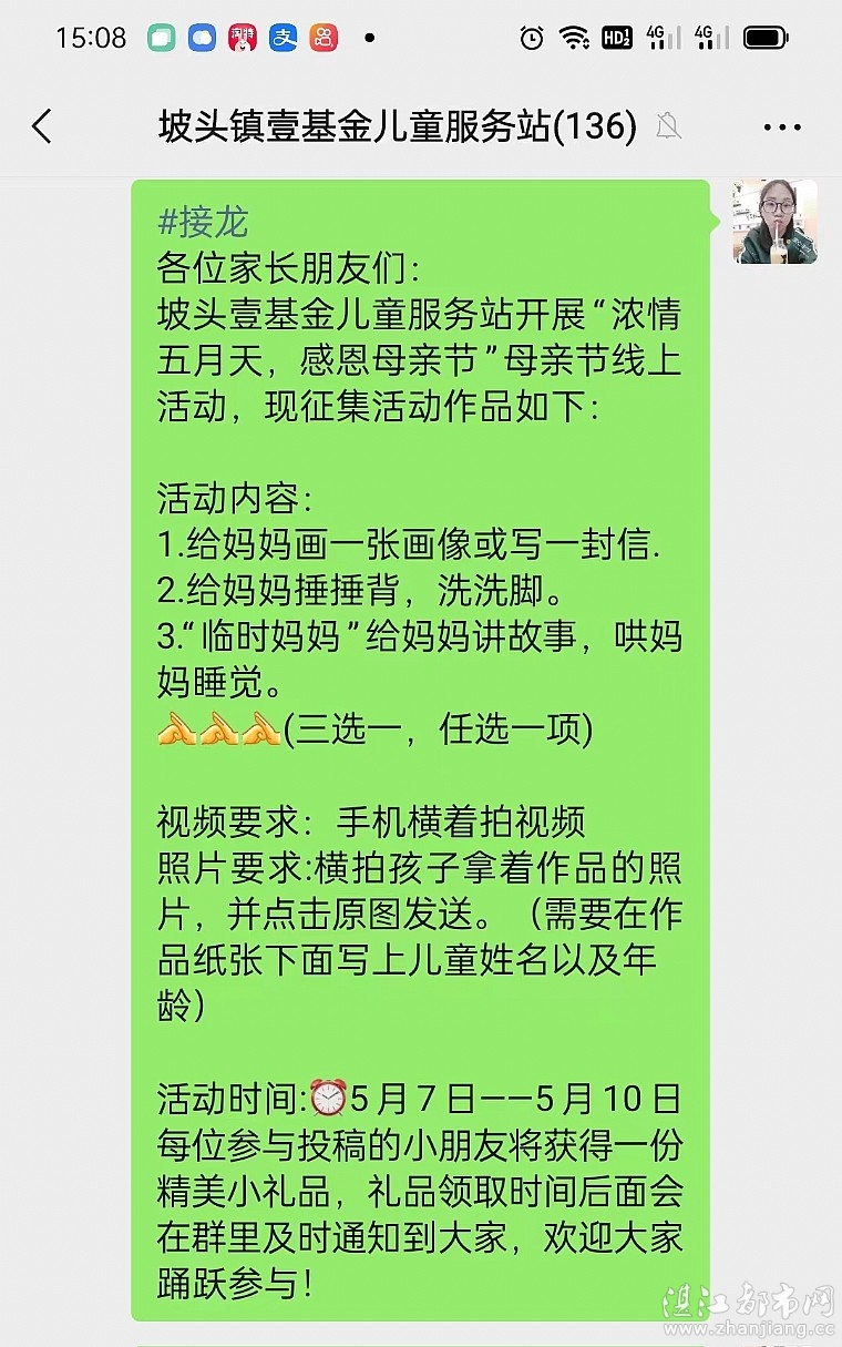 2022年5月10日,坡头区妇联、坡头区文明办、坡头镇妇联主办、湛江市情暖湛江志愿者协会和N1107壹基金儿童服务站(坡头镇文化站)联合开展”浓情五月天,感恩母亲节“线上主题活动。30名孩子与家长参与本次活动。