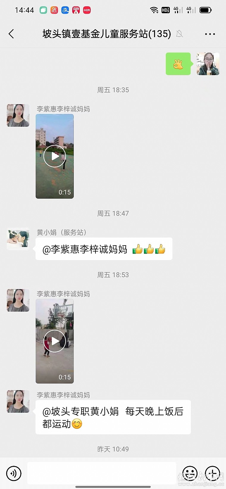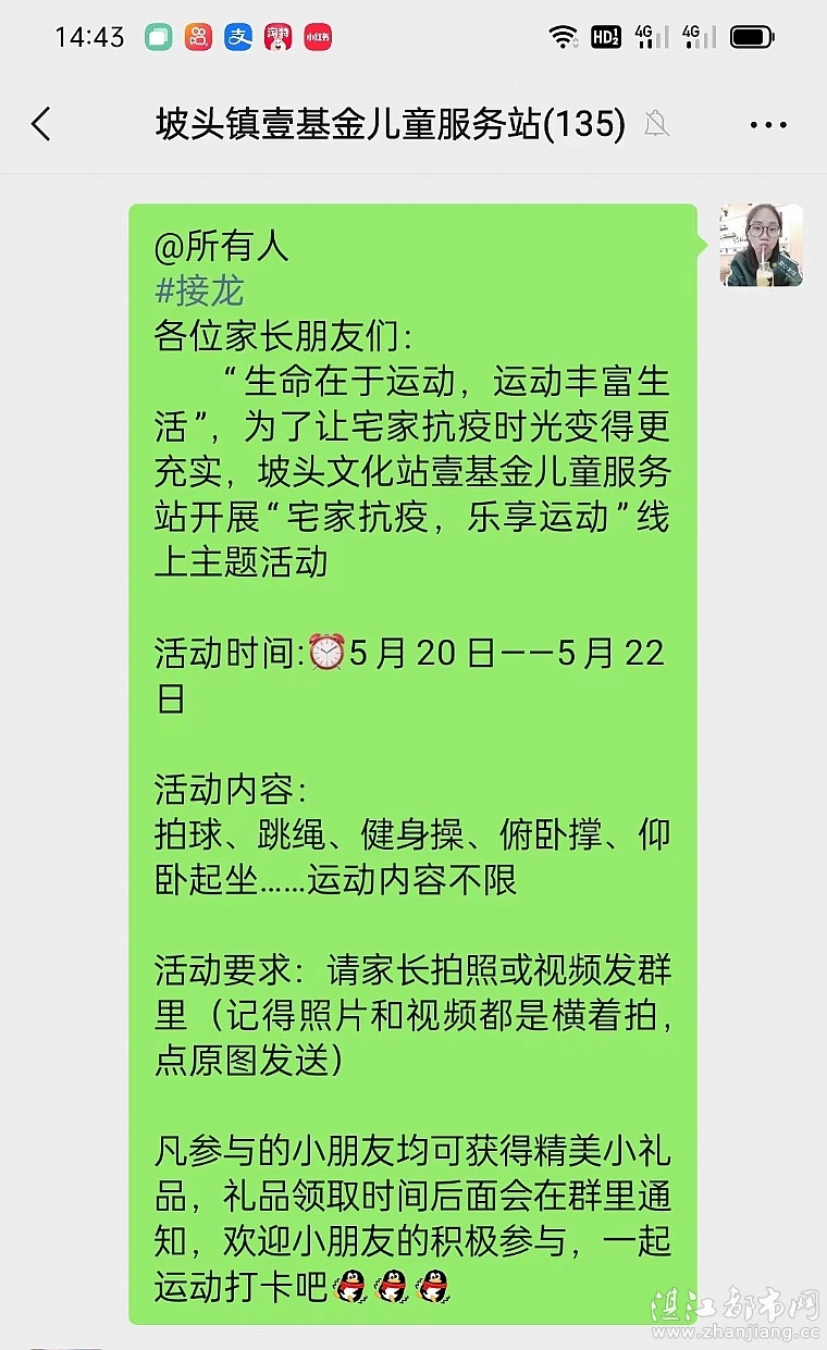 情暖湛江志愿者先在坡头镇壹基金儿童服务站亲子群发布活动内容,得到本群家长和孩子的积极回应,孩子们的运动形式丰富多彩,动力十足。