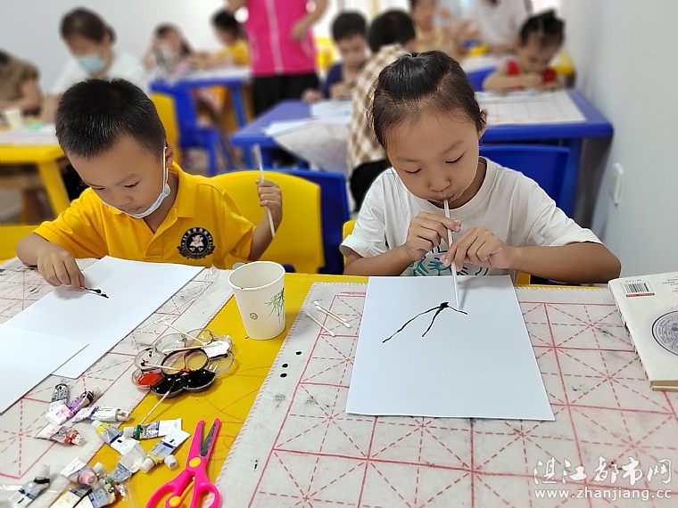 活动开始,情暖湛江志愿者协会志愿者、壹基金儿童服务站老师现场讲解吹画是将墨汁或某种颜色的颜料沾一些在纸上,用嘴吹来代替画笔作画,一般线条都是用吸管来吹墨珠。