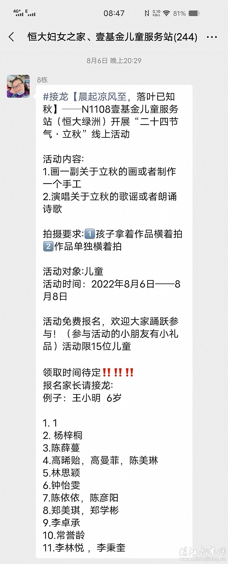 活动中,情暖湛江志愿者协会志愿者在微信群发布活动主题与要求,线上征集孩子们对二十四节气立秋的认识和知道立秋的风俗习惯相关的绘画作品和小视频。