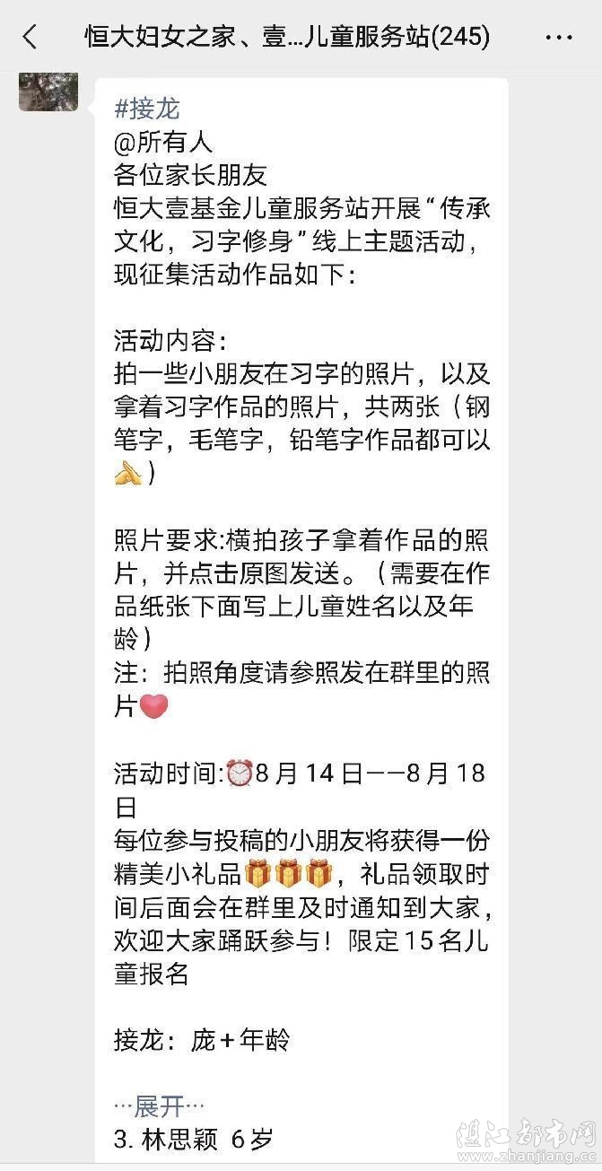 2022年8月14日至8月18日,湛江市坡头区妇联主办,南调村家长学校、湛江市情暖湛江志愿者协会、N1108壹基金儿童服务站(恒大绿洲)承办开展“传承文化 习字修身”线上主题活动。本次活动受益儿童共16人。