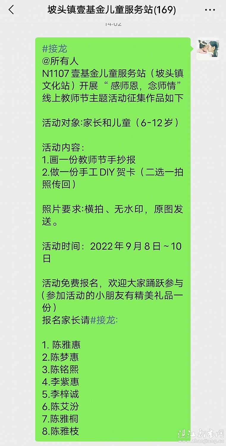 金色九月,桃李芬芳,硕果飘香,在这充满丰收喜悦的时节,我们即将迎来我国第38个教师节。为了让孩子们了解教师节,向老师们表达感谢和祝福,2022年9月8日~10日,由坡头区妇联、坡头区文明办、坡头镇妇联、湛江市情暖湛江志愿者协会和N1107壹基金儿童服务(坡头镇文化站)联合开展“感师恩,念师情”线上教师节主题活动。本次活动共15人参加。