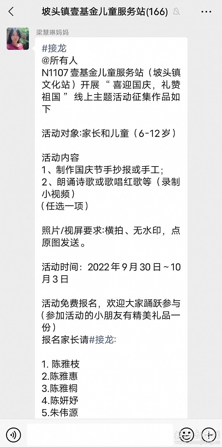 活动中,情暖湛江志愿者在微信群发布活动内容,得到本群家长和孩子的积极回应。孩子们朗诵诗歌《我爱祖国》,深情歌唱《大中国》,精心制作国庆节手工作品及绘制手抄报,通过自己独特的方式,借以表达对祖国的热爱及赞美之情,为祖国生日献上了最美的祝福。