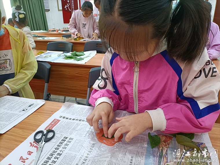 情暖湛江志愿者拿出各种各样的叶子让孩子们通过摸一摸、看一看、说一说的方式了解千姿百态的植物的特征。接着讲解石膏拓印的相关技巧,然后志愿者们把准备好的半成品材料分发下去,孩子们在志愿者的协助下快速地搅拌石膏,然后倒出来,再把叶子压在石膏上,让叶子深深嵌入石膏中,留下叶子的脉络。