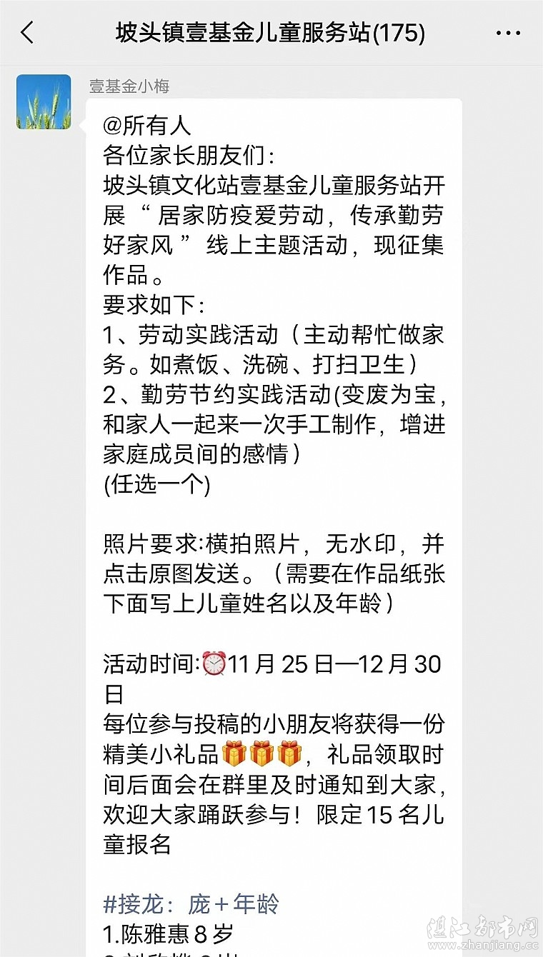 为进一步培养孩子热爱劳动、感恩劳动者的优良品质,传承勤劳的家风文化,2022年11月26~30日,坡头区妇联、坡头镇妇联、坡头区创建全国文明城市工作办公室、坡头镇新时代文明实践所主办,湛江市情暖湛江志愿者协会和N1107壹基金儿童服务(坡头镇文化站)承办“居家防疫爱劳动,传承勤劳好家风”线上主题活动,本次活动共24人参加。