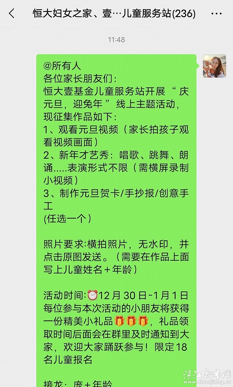 为了让孩子们感受中国传统的节日文化,加深对元旦的了解,2022年12月30日至2023年1月1日,由坡头区妇联、南调街妇联主办,南调村家长学校、湛江市情暖湛江志愿者协会、N1108壹基金儿童服务站(恒大绿洲)承办“庆元旦,迎兔年”线上主题活动,本次活动受益儿童共18人。