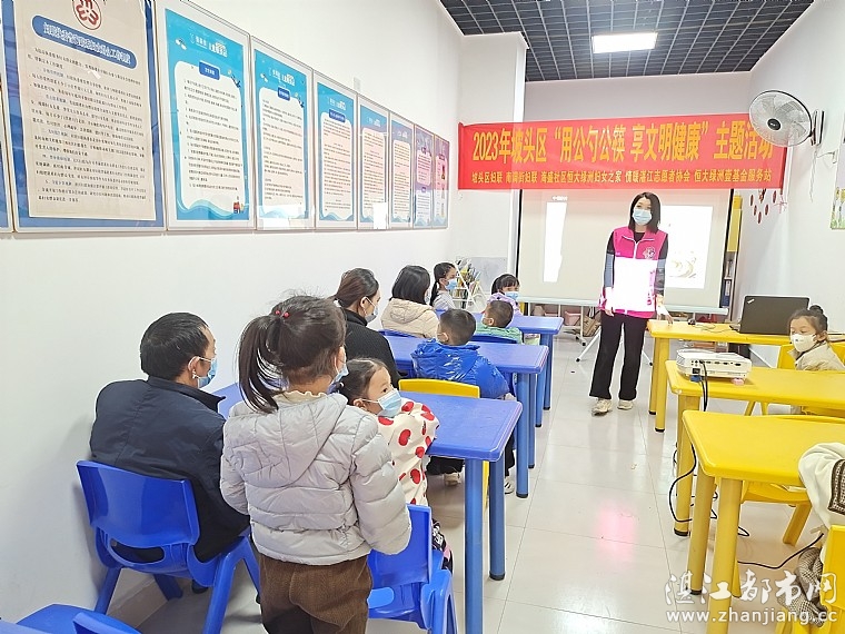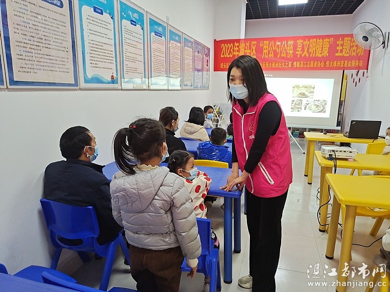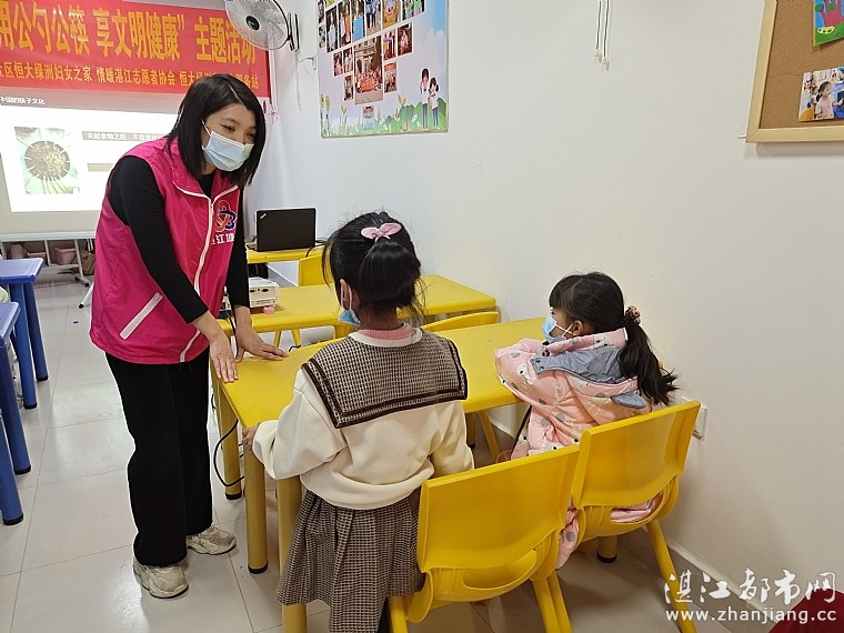 情暖湛江志愿者首先通过课件讲解的形式,结合提问互动的方式,引发孩子们去思考,给亲子们普及公勺公筷的概念,以及为什么要使用公勺公筷,在什么情况下需要使用公勺公筷,如何更好的使用公勺公筷等问题,以此来增加大家此方面的健康知识。