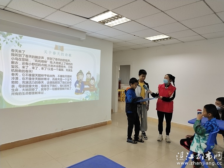 活动开始,春暖社工以“水果蔬菜碰碰碰”的游戏拉开活动序幕,拉近了同学们之间的距离,现场气氛马上活跃起来,充满了欢声笑语。接着,社工通过PPT课件及视频播放的形式,让同学们充分了解世界读书日的由来、意义及阅读的重要性。接着是诗歌朗诵环节,同学们纷纷举手,大胆上台分享关于春天的诗歌,在意兴飞扬的诗行间领略古典韵味,在抑扬顿挫的诵读中展示风采。
