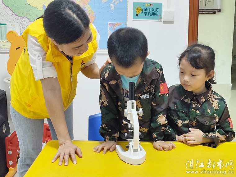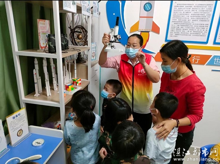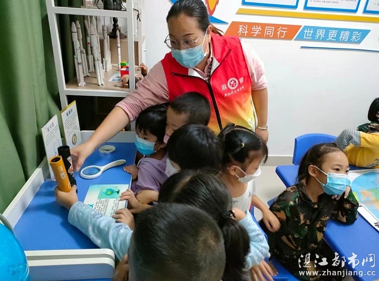 活动中,志愿者带领小朋友们走进科普室,小朋友们被陈列在柜子上的望远镜、地球仪、放大镜、万花筒、化学实验小仪器等等小器材深深地吸引了,都想去看一看、听一听、摸一摸、玩一玩,他们仔细观察,认真体验,小朋友们心中有很多的为什么,都向志愿者一一提问,志愿者也十分耐心地给孩子们讲解。