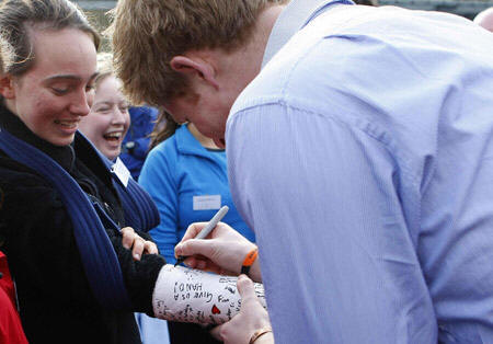 数月前,哈里王子就曾冒着惹怒女王的危险违反皇室规矩,在空军训练团一名手臂骨折的女学员的石膏上签名。身为代表女王签署政府文件并使立法生效的国会议员,严格来说,哈里王子好像并没有签一些会被复制和伪造的签名。然而,女王很可能会原谅年轻的王子,因为他在夏洛特威尔金森伯内特的石膏上写的是“快点好起来——哈里”。