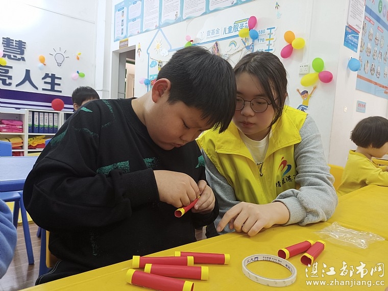 活动中,情暖湛江志愿者专职老师与孩子们一起了解了春节由来的传说故事,并通过春节习俗的歌谣,让孩子们更生动形象地了解我们中国独有的古老的传统节日的优秀文化习俗。活动最后,志愿者们带领孩子们一起动手制作手工鞭炮庆贺新年,通过小组分工合作的形式,让孩子们同心协力共同完成一串串的大鞭炮,提高了孩子们的团队合作精神。