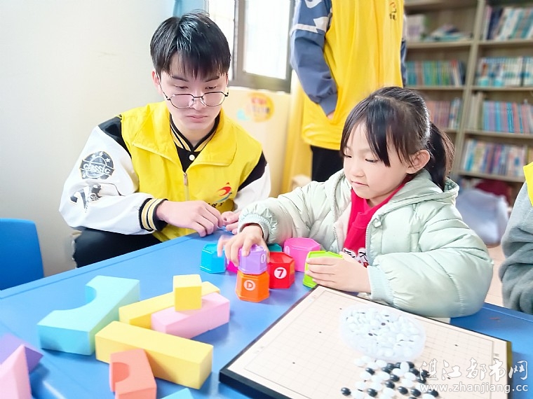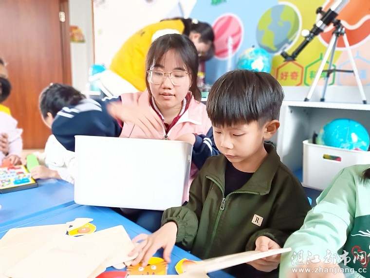 还有小一点的孩子在玩玩具,在玩的过程中,孩子学到了颜色、形状、空间等知识,还能锻炼手部协调、语言表达等能力。并在玩玩具的同时,孩子遇到一些小困难,比如拼图拼不出来,志愿者会引导孩子尝试不同的方法去解决。