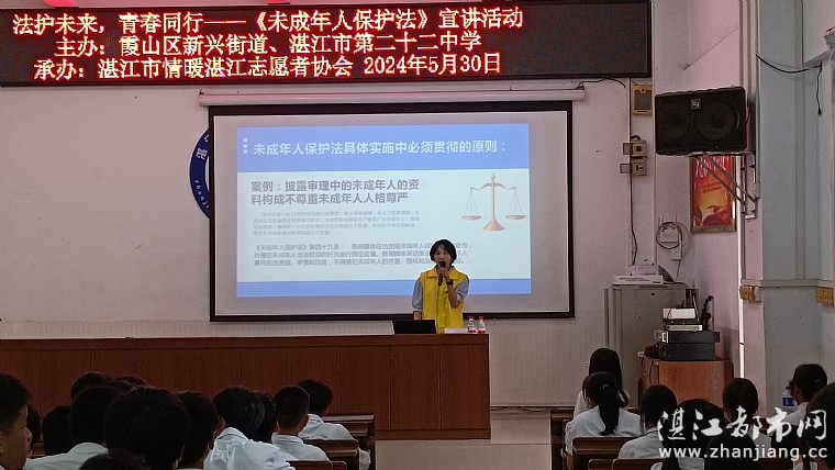 为响应新未成年人保护法施行提高青少年法律意识引导广大未成年人树立自我保护意识530午,霞山区新兴街道、湛江市第二十二中学、情暖湛江志愿者协会联合开展了“法护未来青春同行——《未成年人保护法宣讲活动,本次活动共计150人参与。