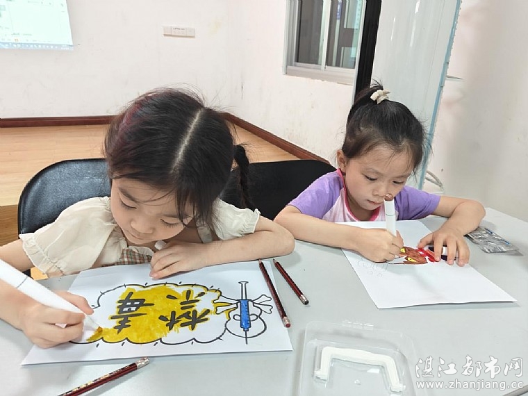 随后,情暖湛江志愿者引导孩子们发挥想象力和创造力,围绕“防范青少年药物滥用”主题进行创意绘画。孩子们拿起画笔,有的描绘毒品的危害性,有的描绘各种毒品的禁止标志等,生动形象的作品,展现了毒品对个人、家庭、社会的危害,表达了孩子们远离毒品的决心。