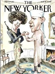 美国民主党总统候选人奥巴马和他的夫人出现在2008年7月份的《纽约客》杂志封面上,两人被描画成“恐怖份子”的模样,漫画上的奥巴马趿拉着鞋,身穿穆斯林长袍,头戴头巾,奥巴马夫人身背AK-47,美国国旗被焚烧在壁炉里,夫妻二人趾高气扬地站在白宫椭圆办公室,壁炉架上还挂着本·拉登的肖像。此举遭到奥巴马竞选团队的谴责,同时还在互联网上引发热议。<br>