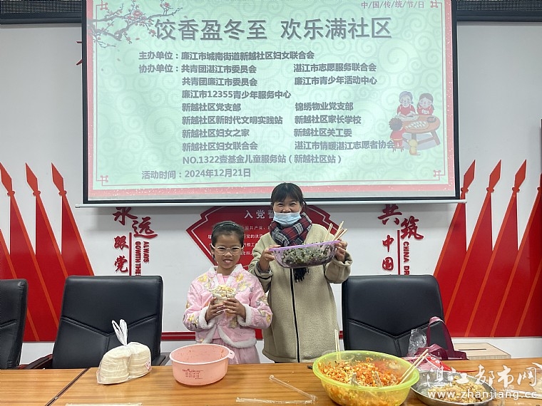 冬至,作为中国的一个重要节气,标志着一年中最长夜晚的降临。在这个特别的日子里,家长与孩子们携手合作,共同体验包制饺子的乐趣,并且传承了中国的传统文化。2024年12月21日,由新越社区妇女联合会主办,共青团湛江市委员会、湛江市志愿服务联合会、共青团廉江市委员会、廉江市青少年活动中心、廉江市12355青少年服务中心、新越社区妇女之家、新越社区关工委、新越社区新时代文明实践站、新越社区家长学校、湛江市情暖湛江志愿者协会和壹基金儿童服务站(新越社区站)协办,开展了“饺香盈冬至 欢乐满社区”冬至包饺子主题活动,家长、孩子和情暖湛江志愿者共45人参与了此次活动。