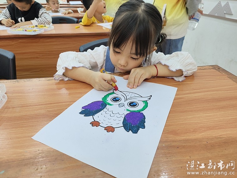 活动的最后,迎来了充满创意的绘本拓展环节——为猫头鹰涂色。志愿者们为孩子们分发了印有猫头鹰轮廓的画纸和彩色画笔。拿到画笔的小朋友们立刻化身小小艺术家,发挥天马行空的想象力,为猫头鹰穿上五彩斑斓的“外衣”。有的小朋友给猫头鹰涂上了明亮的黄色,有的偏爱神秘的蓝色,还有的搭配出粉紫相间的可爱配色。一幅幅色彩鲜艳、充满童趣的作品新鲜出炉,孩子们捧着自己的画作,成就感十足。