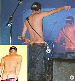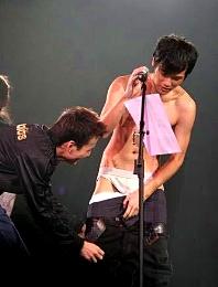 <br> 日本男歌手台北演唱会上脱光全裸遭逮捕日本“银杏Boyz”乐队主唱峰田和伸在台北演唱时一件件脱掉衣服,最后突然脱掉仅存的内裤,令全场几乎陷入疯狂。后被警方以涉及刑法妨害风化罪,带回警署询问。而主办方解释:“只是在鞠躬的时候不小心裤子掉了下来。”<br> <br> <br>