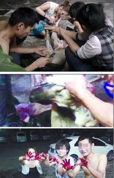 <br> <br> 近日标题为《令人发指,一群90后男女街头活剥小狗》的帖子在网络上迅速传开,帖子中有7张照片,几个年轻人撕扯狗腿和皮毛,有些血腥。一张照片上,一名女孩轻松地笑着,背景是杀狗画面;最让网友看不下去的是,一张照片上,3个青年张开血淋淋的双手,做着鬼脸。发帖人说:“不知道是出于好玩,还是为了炫耀!剥皮的时间一点都不恐惧吗?平日里见个蟑螂都要大声喊救命的女生啊,活剥的为什么不是你!”<br> <br>
