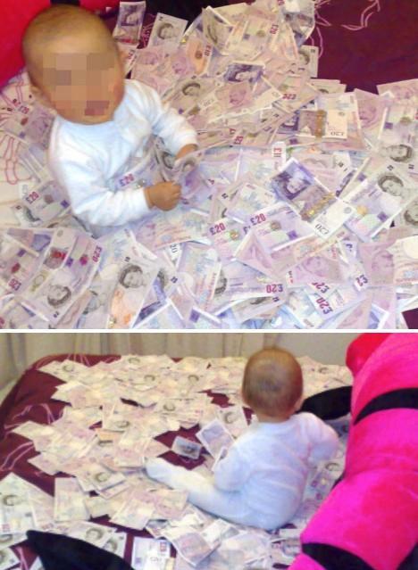 <br> <br> 家长一般会给孩子毛绒玩具或电动汽车玩,而富莱德斯特·安都·布鲁却给他9个月大的儿子一座“钱山”玩。2008年7月,时年34岁的布鲁通过克隆银行卡,从自动提款机里非法盗取了100多万英镑现金。他把盗来的大把现钞撒落在床上,让孩子在“钱山”中玩耍,然后拍成照片,目的是向罗马尼亚的家人表明,在英国做到金钱滚滚而来是多么容易。英国赫尔刑事法庭裁决布鲁因克隆超过2000张银行卡、非法榨取他人钱财,被判5年有期徒刑。<br> <br>