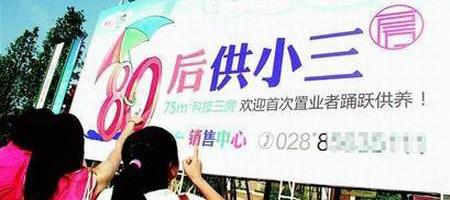 <br> <br> 楼盘广告——“80后供‘小三’房”<br> 城市广告语——“一座叫春的城市” <br> 饮料广告语——“大家一起爽歪歪” <br> 牛奶广告——“我从未见过如此结实的臀部。我有没有弄痛你?你最喜欢什么方式?是捏?还是摸?我知道了!小美人,来!我们再做一次!” <br> 房地产广告——“我要高巢” <br>
