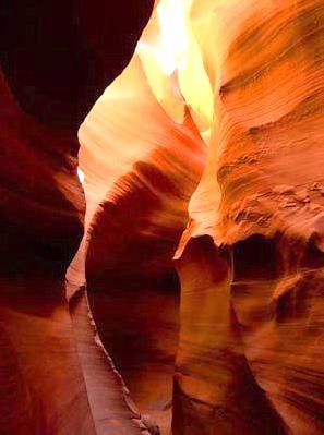 位于亚利桑那州南部鲍威尔湖边上的下羚羊峡谷是由风沙和湖水雕琢沙岩而形成的一种很抽象的形状。从上面看,峡谷和亚利桑那其他峡谷没有任何区别,但是从底部看,你会觉得自己深处一件很精美的艺术品中。峡谷的有些地方很狭窄,只允许一人通过。<br>