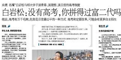 白岩松:如果没有存在很多毛病的高考,我们可能没机会这样面对面对话。中国高考有万千毛病,但却是目前最公平的一种的方式。没有高考,你拼得过富二代吗?