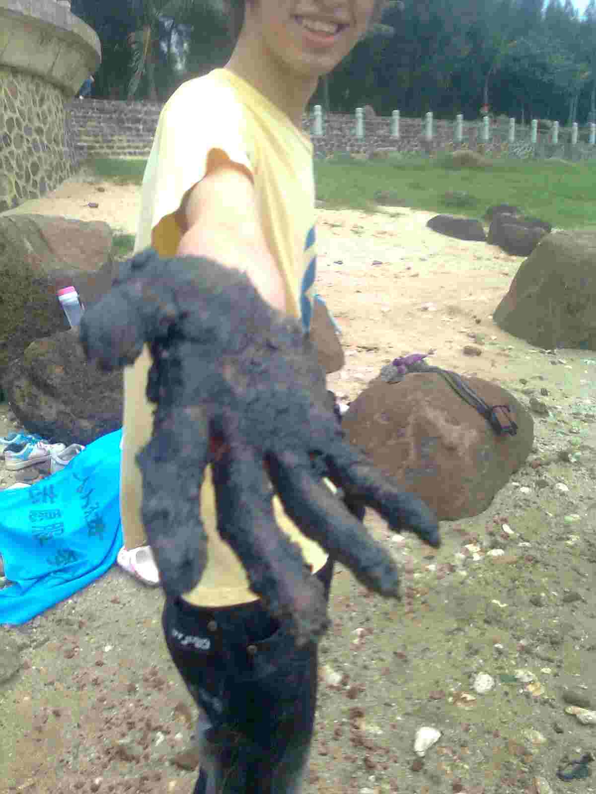 雯雯走到了海滩较外的地方,谁料鞋子都陷进泥巴拖不出来了,幸好雯雯妈机智勇敢,拖出一块木板毫不畏惧地替雯雯把陷进去的鞋子拔了出来。看看,这拿出来的鞋子……简直是泥做的啦!许源妈妈在旁边直感叹,妈妈一直是很伟大的哦!看来当母亲的心情都是一样的,其实大家也深有同感,母爱是伟大的。