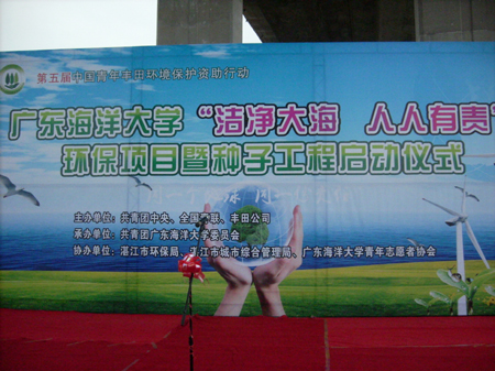 今天(711日),小瓜、飞鸟未来、WOO、空中白鸽、小雪、夏天、特莱西、梁姐、啊强、kevin、泽源、追梦、上官、和尚、宵夜、小白,还有11岁的雯雯和6岁半的陈许源,我们18个人一起参加了“第五届中国青年丰田环境保护资助行动以及广东海洋大学‘洁净大海、人人有责’环保项目种子启动仪式”。题目蛮长的,但是简单说,就是大家一起代表情暖作为嘉宾参加了环保启动仪式和红树林的种植。以身作则,号召大家洁净大海、保护海洋!希望这次活动能在大家的心中种下海洋环保的种子!