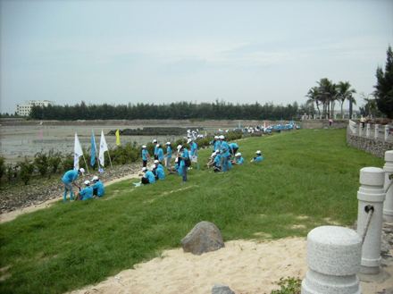 这是栽种的小树苗,是不是很不错?非常平整美观吧?这都是大家的辛劳和不怕脏不怕累换来的哦,虽然很脏很累,但大家还是乐在其中,潮湿的沙滩留下了情暖的一串串泥脚印……