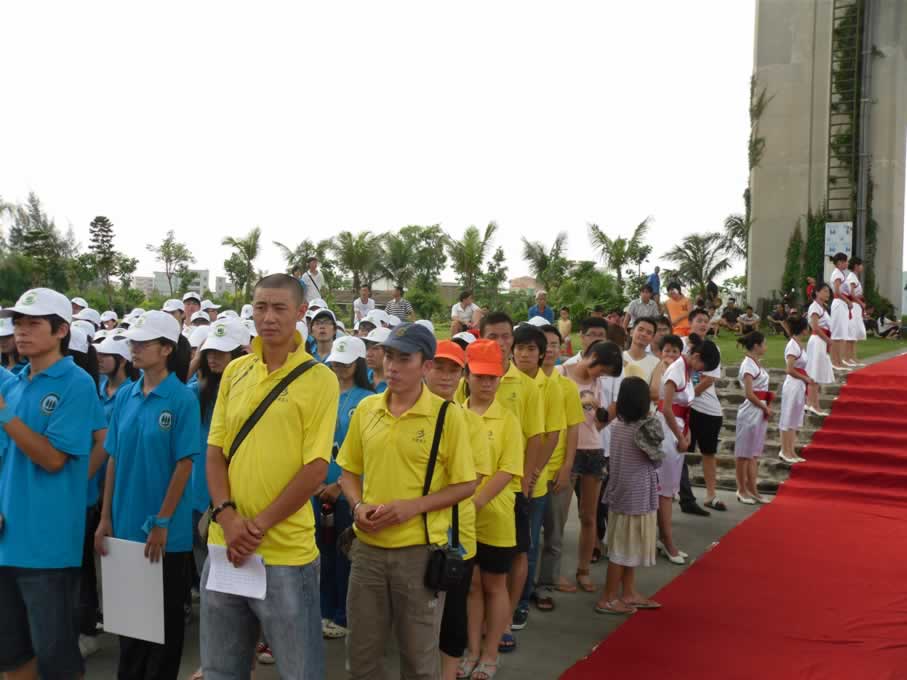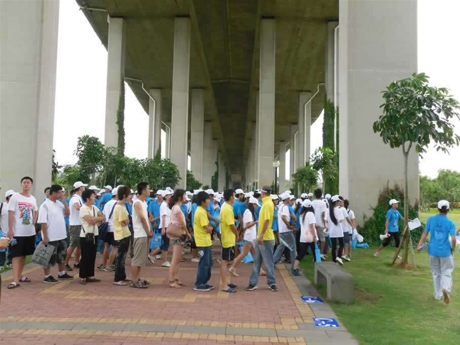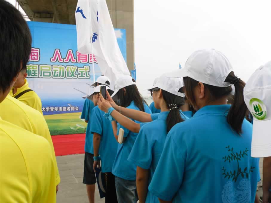 下午三点钟,大家在湛江跨海大桥下集合,和众多的志愿者一起排队啦!虽然我们只有一小队人马,可是站在一大片蓝色的大军里还是格外显眼滴!