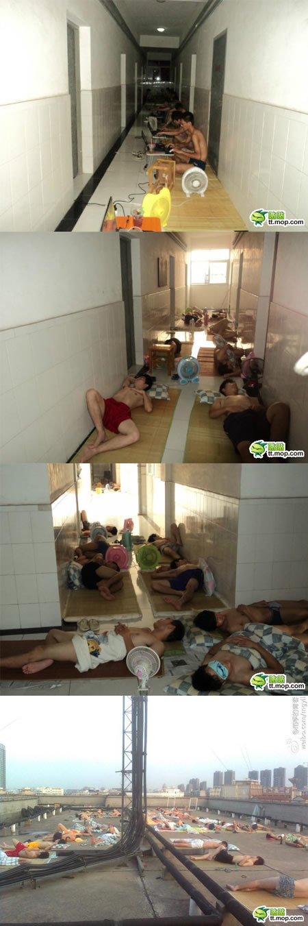 炎夏到了,各种鸭梨接踵而至:接近40°的天气、桑拿室一般的宿舍、滚烫的床板、复习的鸭梨…宿舍没空调的孩纸桑不起!没风扇的孩纸更桑不起!限电连自己买风扇都不行的孩纸最桑不起!于是,勤劳聪明的孩纸们开始了千奇百怪的防暑降温计划…