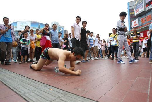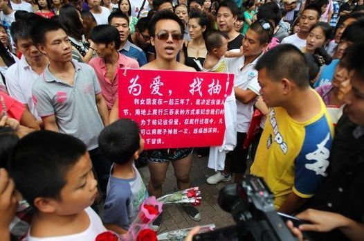 七夕节,长沙步行街一男子上演“为爱找抽”,引来市民围观。
