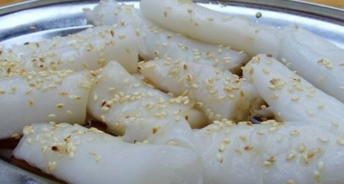 猪肠粉是将大米磨成浆,然后蒸熟成薄块状,将蒸好的薄块卷成1尺左右长的猪肠形,切成小节调入咸甜酱、米酒醋、蒜茸、香油食用。猪肠粉香滑爽口,是湛江的一道特色美食,无论是在夜市摊点还是出售早餐的小铺,都可以见到。