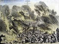 <br> 发生于公元1657年3月2日,持续2天。明历大火发生于日本江户,也就是今天的东京。当时江户本妙寺正在为一名得重病去世的少女做法事。法事结束后火化遗体时刮起了强风,风将遗体上一只燃烧的衣袖刮走并引燃了建筑物大火。当时的江户人口密度极高,普通平民一般只有6块榻榻米(约9.6平方米)大小的居住空间(厕所、厨房、卧室均包括在内),道路拥挤,防火措施落后,房屋基本为全木结构,耐火能力极差。这场持续两天的大火烧毁了江户城三分之二的区域、烧死三分之一人口(共造成107000人死亡)。<br> <br> <br>