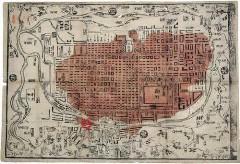 <br> 发生于1788年3月7日,持续2天。天明大火发生在京都,是京都历史上最严重的火灾。本图是火灾后官方绘制的火势图。其中红圈代表起火点,红色涂抹的区域则是火灾危害的范围。天明大火起于市郊的一所空屋,引火原因不明,但是强风加上全木结构的城市建筑很快导致火势无法控制。根据江户幕府在灾后公布的记录,这次火灾烧毁了36797间房屋,201间寺庙,37间神社。<br> <br>