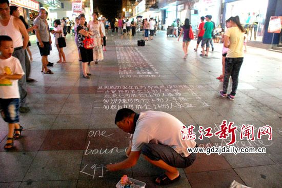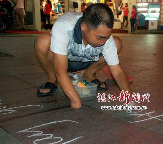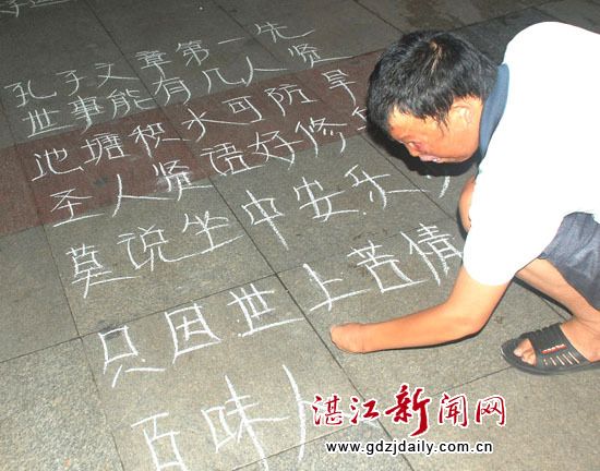 受人启发,徐大哥开始用粉笔在地上写字谋生。当年为上大学而刻苦练出的写字功夫,现在意外地派上了用场。徐大哥说他现在每晚上要写掉两盒粉笔。 (湛江街头的“粉笔大哥”/图)