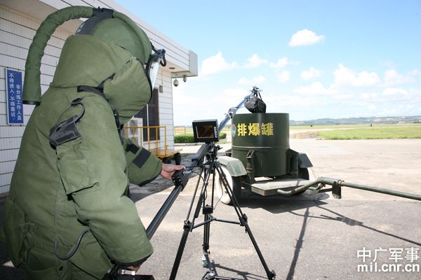 身着防爆服的专家操纵机械臂对危险物进行排爆