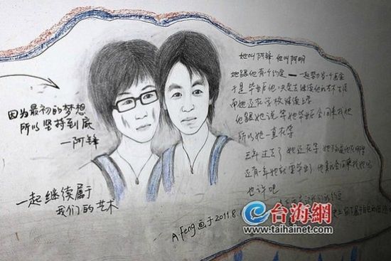 阿锋在涂鸦墙上素描了她和阿明两人的画像,一个清秀的年轻男子和一个面带忧郁的短发年轻女子。
