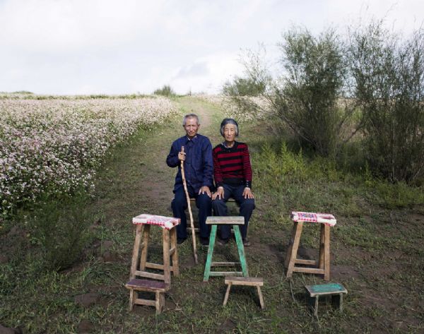 陕西省靖边县席麻湾乡,67岁的田云秀(左)和65岁的老伴刘德珍在村里的荞麦地边(8月24日摄)。田云秀家有6个孩子离开农村出去打工
