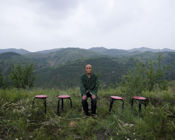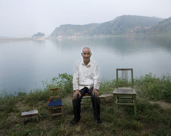 陕西省白水县林皋镇,66岁的焦栓成坐在家附近的湖边(8月27日摄)。焦栓成有3个孩子外出打工。