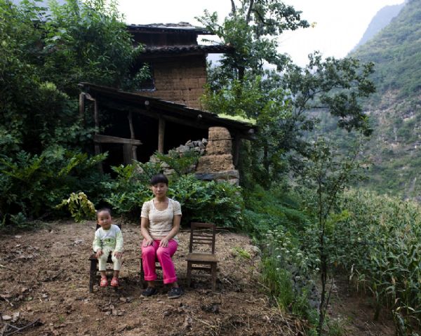 陕西省旬阳县石坪村,吴会琴和两岁的儿子在家附近的空地上(8月30日摄)。吴会琴的丈夫外出打工。