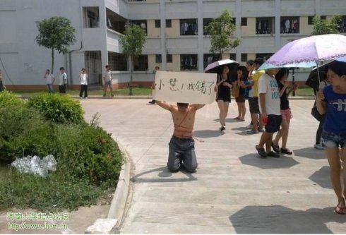 近日,在海南大学起点论坛上曝出了一组名为“海南认错哥裸身下跪”的照片,照片中一男生头举写着“小慧!我错了”字样的牌子,裸身背负一枝条跪在了女生宿舍楼下。网友戏称该男生为“认错哥”。对于海南认错哥裸身下跪,网友褒贬不一,但支持的多些,表示为挽回真爱放弃尊严,令人敬佩。