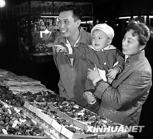 1963年国庆节、中秋节接踵而来,北京市食品市场,呈现出一片繁忙热闹的景象。全市的各个商场、食品店、水果摊为顾客们准备了丰富多样的节日食品,供人们欢度佳节。这是市民在北京特产——蜜饯果脯摊前。