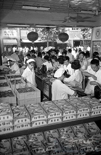 这是1979年9月25日,上海市民在选购上海冠生园制作的“西施醉月”、“嫦娥奔月”、“平湖秋月”等特色优质月饼。1979年,曾中断16年的上海冠生园自制中秋月饼重新大量生产,恢复供应。